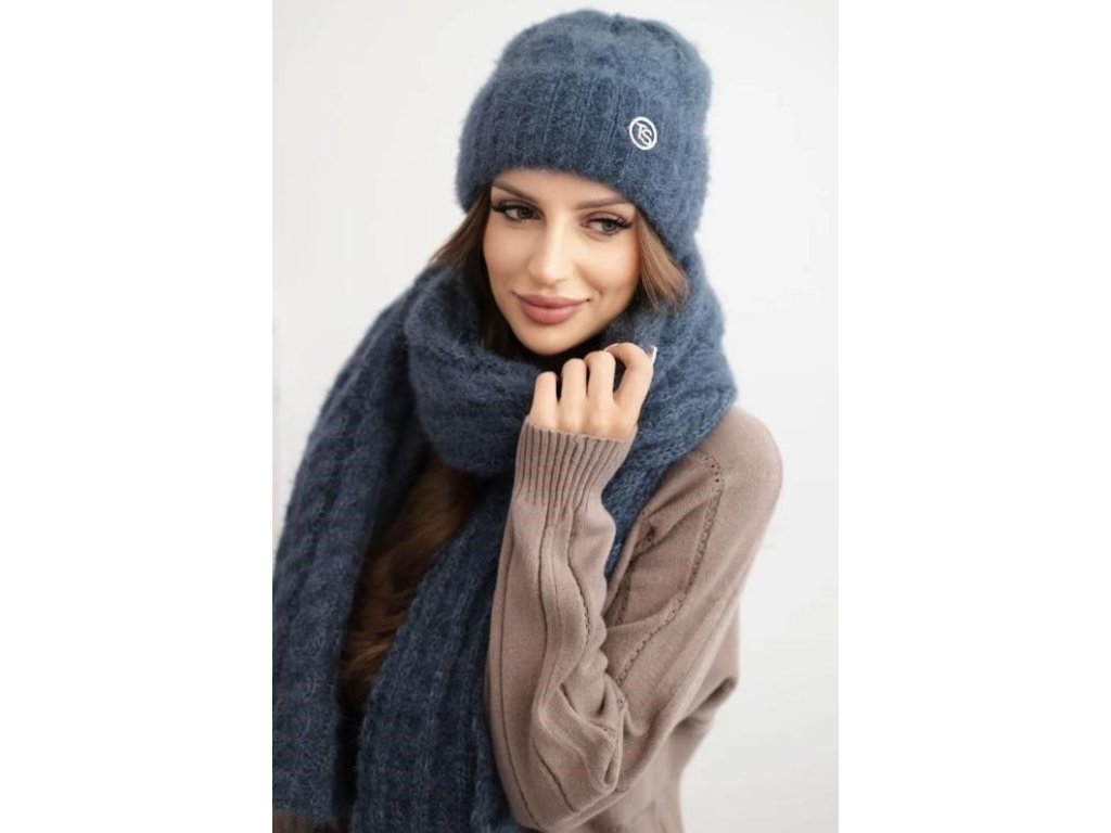 Čepice má klasický střih ohrnutím a zlatou ozdobou. Šála je dlouhá a široká - lze ji volně omotat kolem krku, což zajištuje ochranu před zimou. Je to praktická a módní sada, ideální jak na každodenní nošení, tak jako doplněk k elegantnějšímu outfitu.